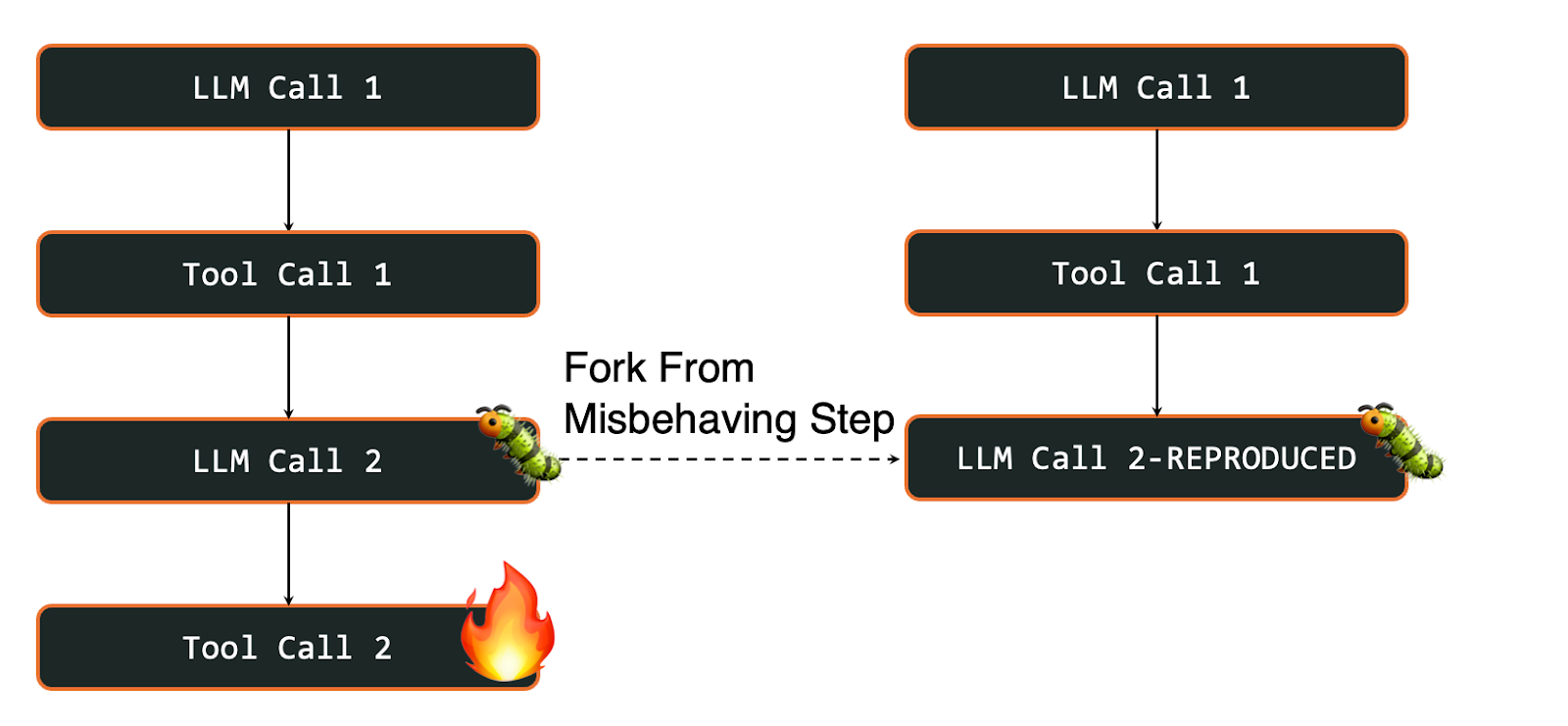 Durable workflows also solve a harder problem than fault tolerance: helping you reproduce and fix deeper issues in your agent’s prompts and tools. In particular, you can fork a workflow to create a copy of it with all its checkpoints up to a specific step, then restart execution from that point. Think of this like a "git branch" for workflow execution, where you create a separate branch that diverges from a specific moment in your agent's run.