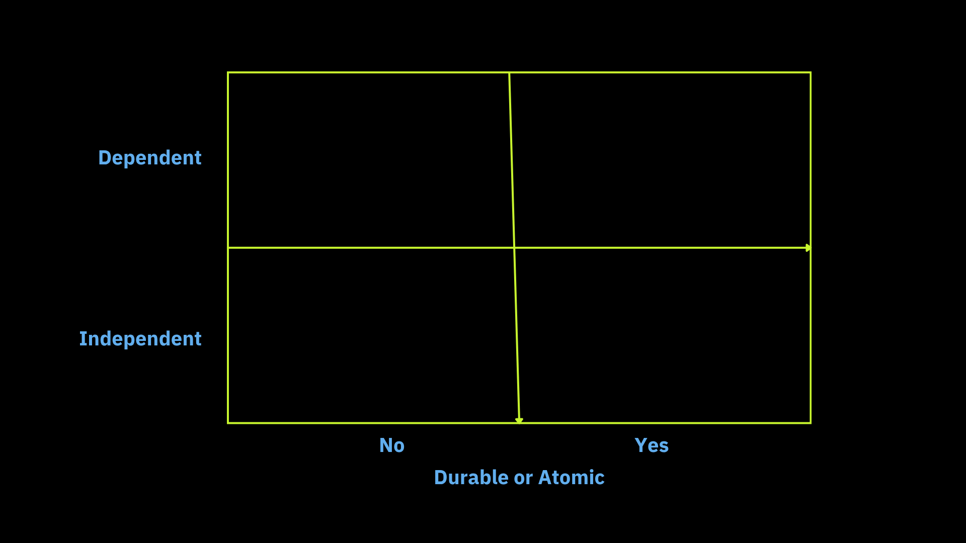The horizontal axis classifies multi-step applications as requiring either durability or atomicity. Atomicity is required if the application has only two permissible final outcomes: Either it fully and successfully completes, or it must look like it never started. This all-or-nothing behavior is used to guarantee that the state of an accompanying database or databases is always left in a consistent state. In our application, one wants to ensure that the customer only pays for the ordered item if it is shipped. Otherwise, the reserved item must be returned to inventory. A less demanding condition is durability. In this case, if the application fails partway, either because of a software or hardware error, then the application can pick up where it left off when the error is resolved. This saves resources if the application is long-running because previously completely steps do not have to be reprocessed. It also, guarantees that an item will not be reserved twice or paid for twice.
