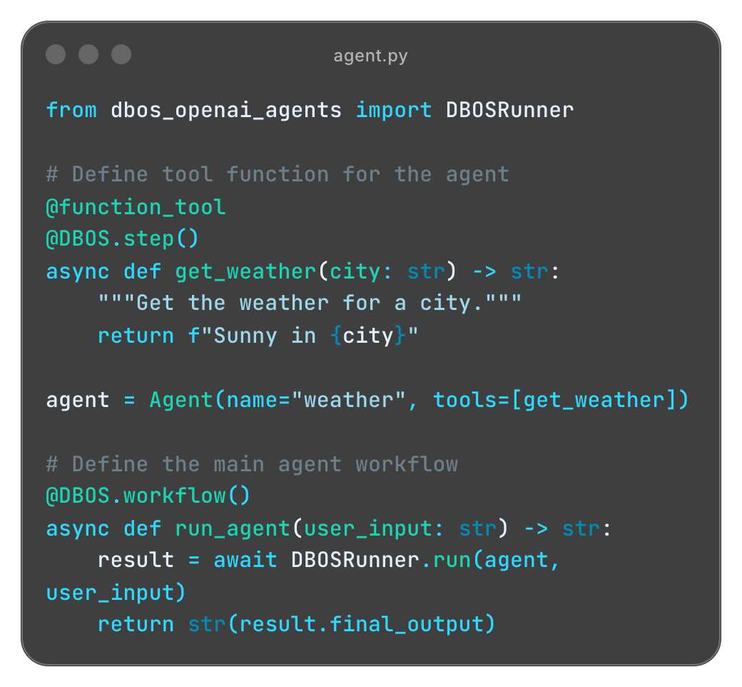 Add durable workflows to your app in just a few lines of code. No additional infrastructure required.