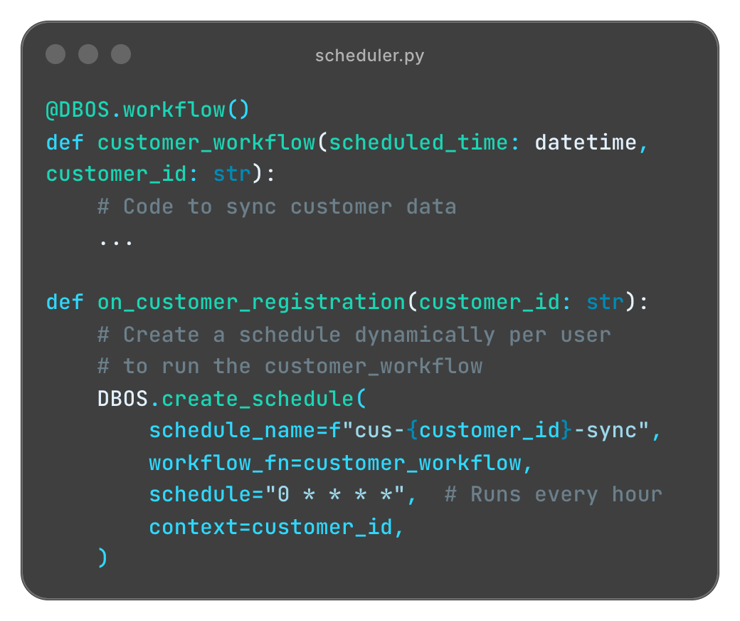 Schedule durable workflows to run exactly once per interval. Create, update, or backfill schedules dynamically without managing external schedulers.