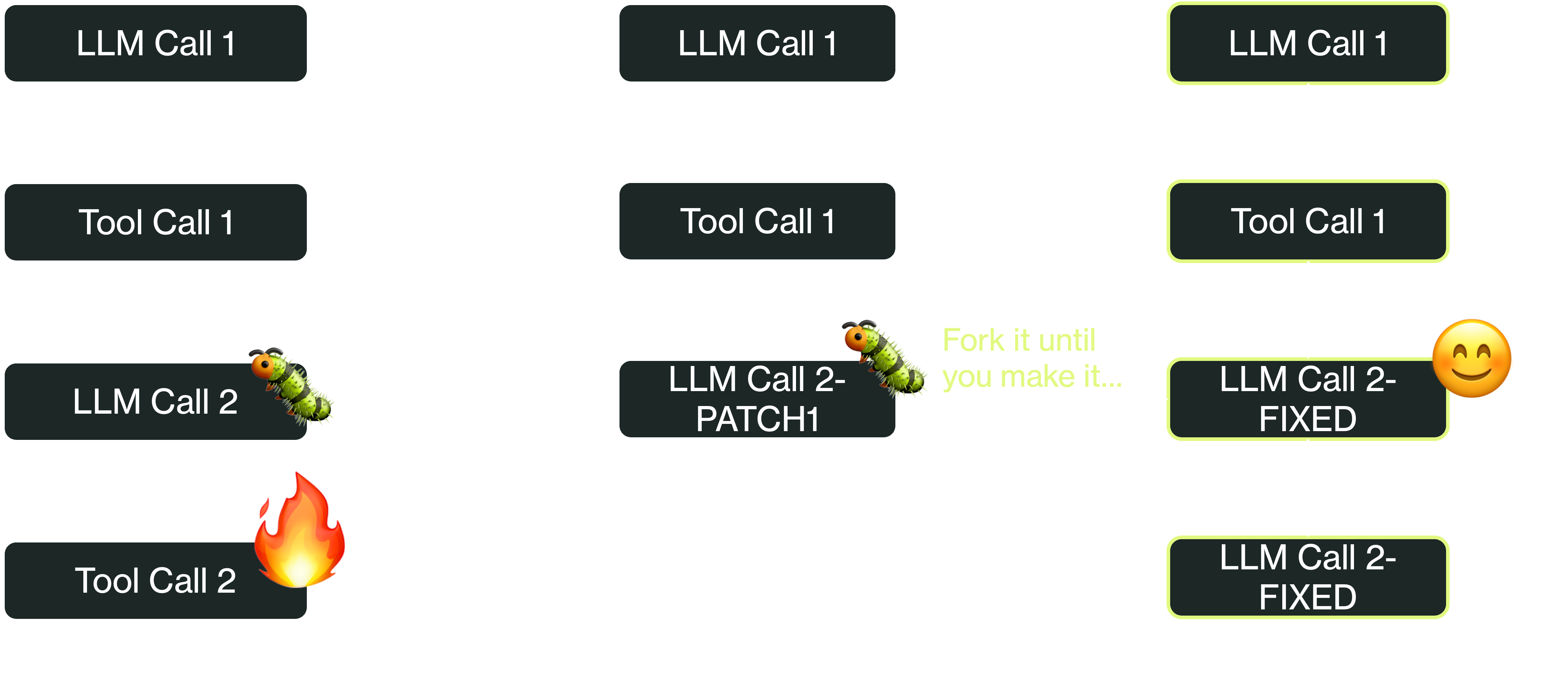 One non-obvious benefit of this reproducibility is that you can rapidly iterate on and test fixes. Once you’ve identified the source of the issue, apply a fix to the misbehaving step, fork and restart the workflow from that step, check if the issue was fixed, and repeat until successful. Being able to isolate and iterate on the problematic steps is especially useful for complex agents where testing from scratch would take a long time and burn too many tokens.