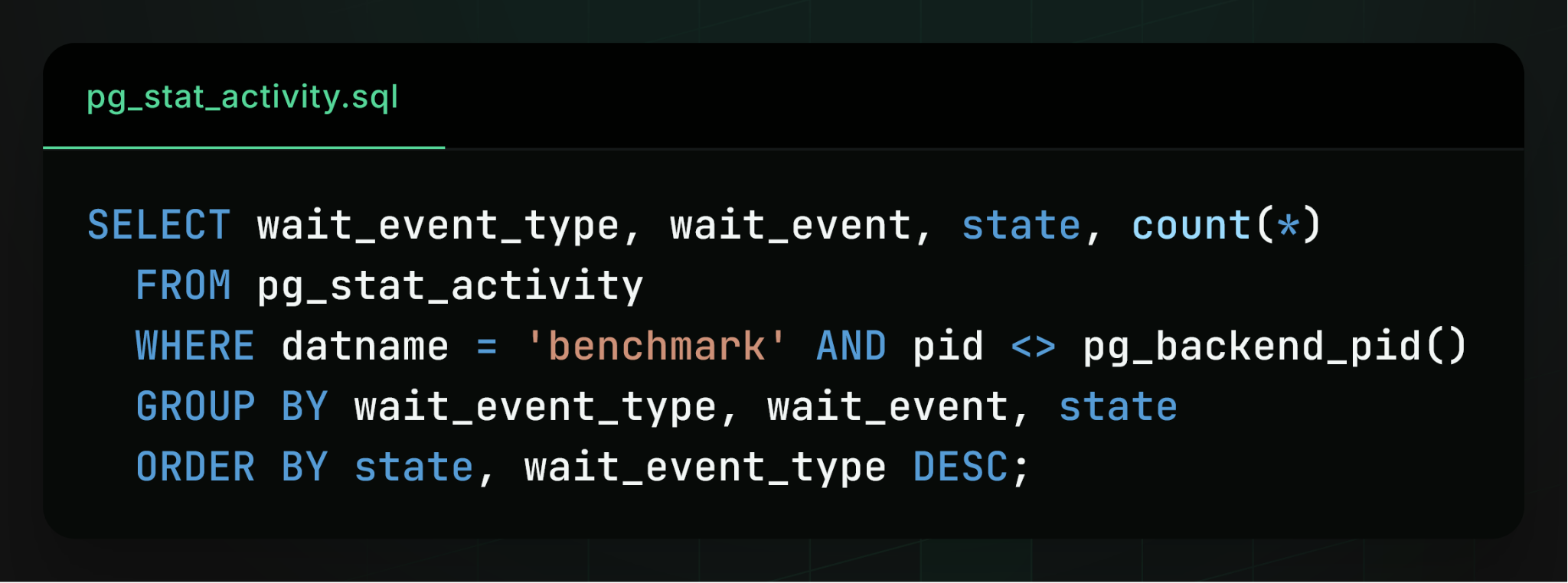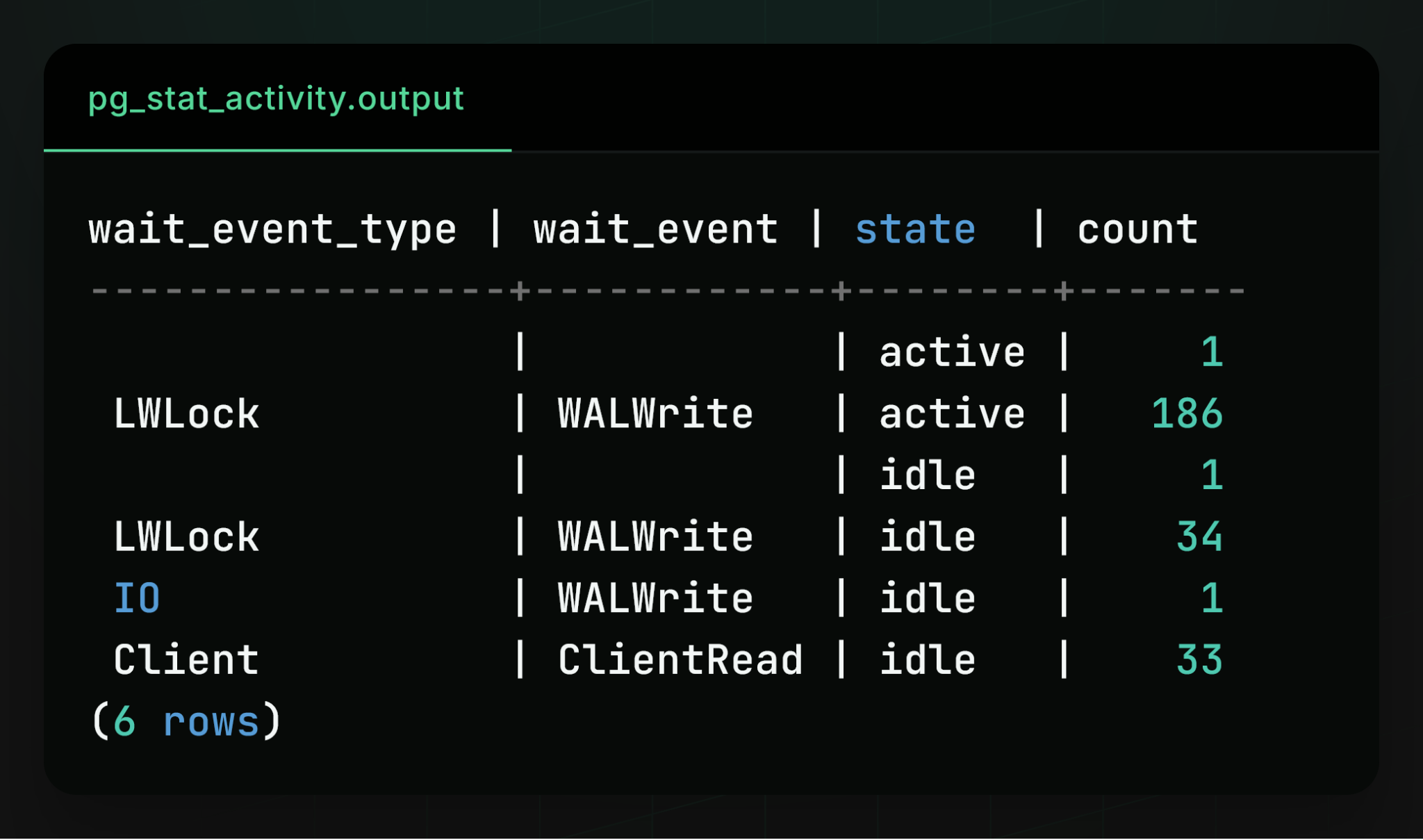 To make sure we’re reaching the limits of Postgres scalability, we also set out to find the bottleneck that constrains further performance. We first checked top-line metrics like CPU and IOPS, but found they weren’t fully utilized. To find the real bottleneck, we then queried the built-in Postgres pg_stat_activity table to inspect what each Postgres backend process was doing at each moment in time: