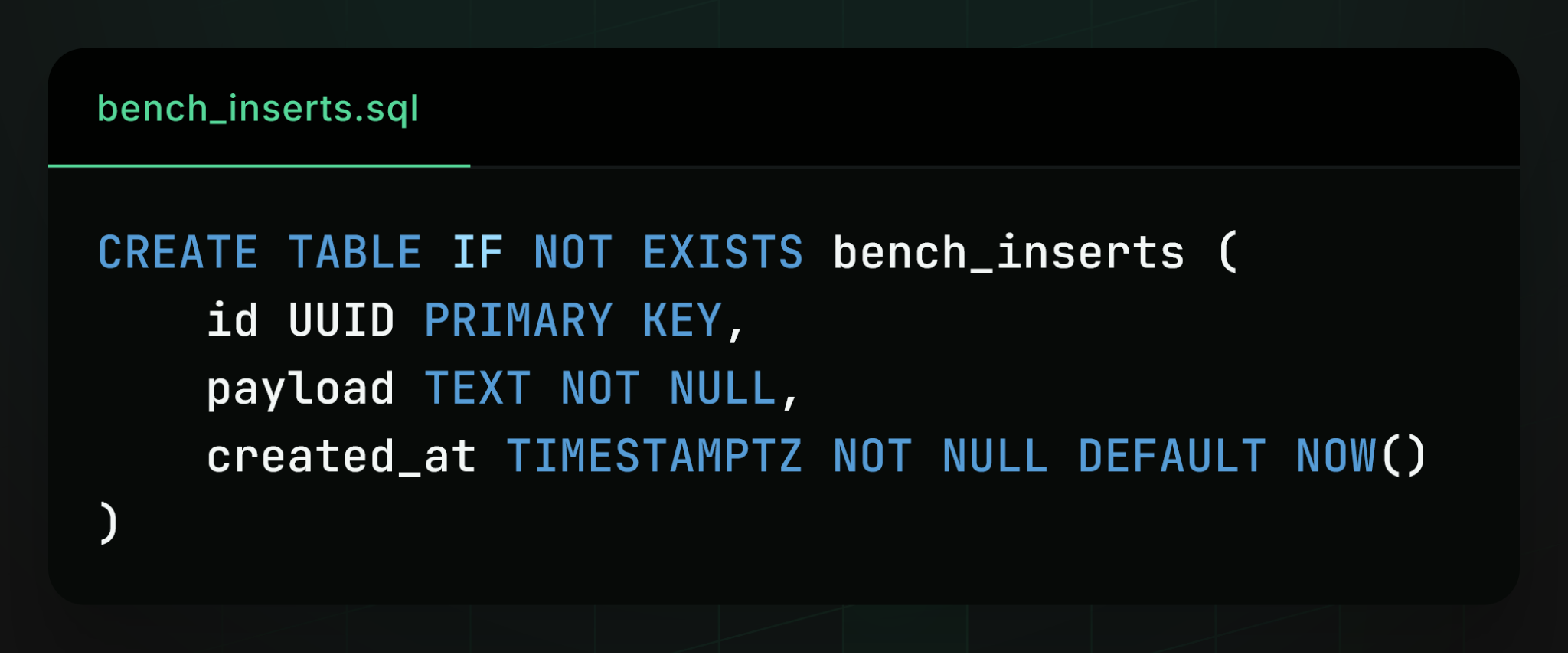 We first measure the maximum write throughput Postgres can sustain to a single table. We use a simple three-column table with a UUIDv7 primary key, a TEXT data field, and a timestamp: