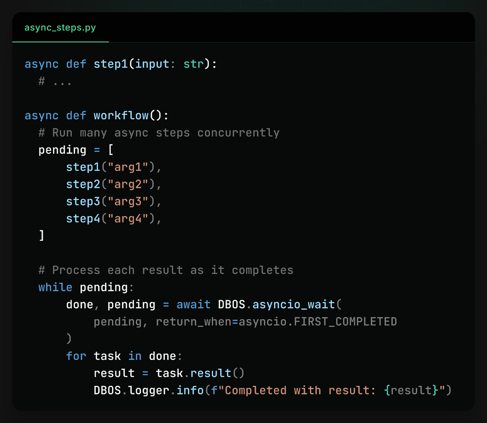 For concurrent steps, we added support for durably waiting for the first of multiple async steps to complete in Python (DBOS.asyncio_wait). It is a durable wrapper around asyncio.wait with the same interface and semantics. It checkpoints which futures are done vs. pending so the result is deterministic during workflow recovery. This allows you to retain the performance benefits of async execution while maintaining correctness under failure.