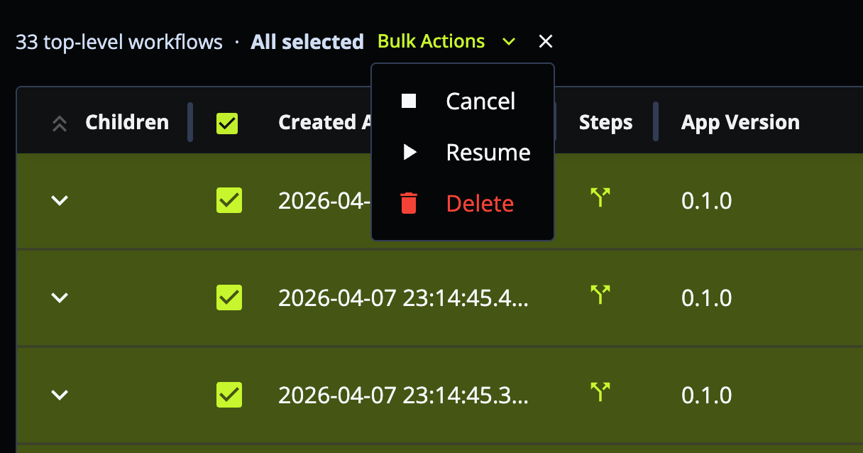 You can now execute bulk workflow operations, including cancel, resume, and delete, either programmatically or directly through the web UI. This is useful for sweeping operational tasks, such as canceling all workflows that have been stuck pending for the past hour.